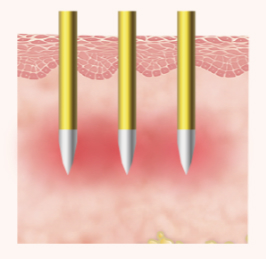 Unter örtlicher Betäubung mit einer speziellen Betäubungscreme oder regionalen Nervenblocks ist die Behandlung in der Regel nicht besonders schmerzhaft. Ein Gerät zur Luftkühlung kann die Schmerzen noch weiter reduzieren. Hilfreich ist außerdem die Einnahme von vier Paracetamol Tabletten à 500 mg etwa 60 Minuten vor der Behandlung. Nach einer gründlichen Reinigung mit 70%igem Isopropylalkohol wird das zu behandelnde Hautareal schachbrettartig mit dem 1cm2 großen, quadratischen Handstück abgearbeitet. Innerhalb von wenigen Millisekunden dringen 49 sehr feine Goldnadeln senkrecht 0,5-2,0 mm tief in die tieferen Hautschichten ein und erwärmen diese durch einen hochfrequenten Stromimpuls. Da die Nadeln bis auf ihre 0,3mm lange Spitze vollständig isoliert sind, und nur dort Strom abgeben, werden die oberen Hautschichten nahezu komplett verschont. Dies reduziert Schmerzen, Ausfallszeiten und Nebenwirkungen auf ein Minimum. Die Parameter Eindringtiefe, Energiedichte und Dauer des Impulses werden je nach Diagnose und Behandlungsareal variiert. Aus Hygiene- und Qualitätsgründen wird für jeden Patienten ein gesondertes Einmalhandstück verwendet, das nach Abschluss der Behandlung entsorgt wird.  |